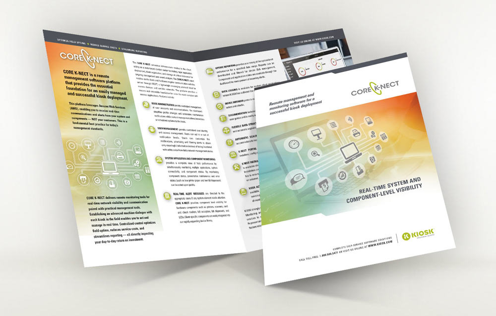 KIOSK Core K-Nect Brochure. Full-color, bifold brochure. Finished size 8.5"x11" (A4 International version as well)
