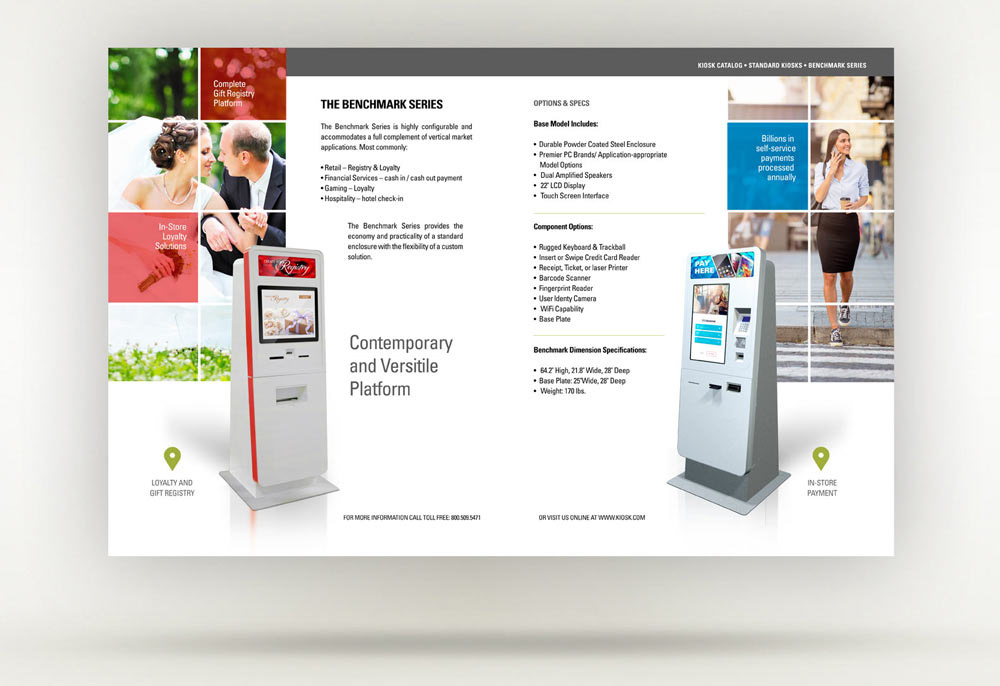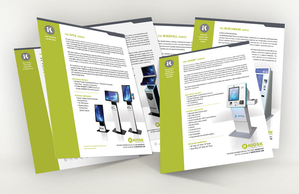 KIOSK Product Tear Sheets. Sales Support – Full-color, 1 and 2-sided, finished size 8.5"x11" (A4 International versions as well)